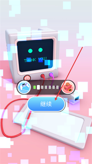 4、关卡完成后显示【THANK-YOU!】提示,点击箭头指向的【继续】按钮,即可进入后续关卡开启新的互动挑战。