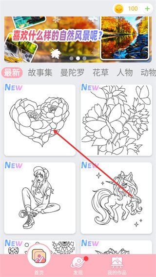 1、进入游戏界面,可通过分类标签筛选模板,点击箭头指向的【心形花朵模板】,即可进入该图案的涂色界面,开启涂色创作。