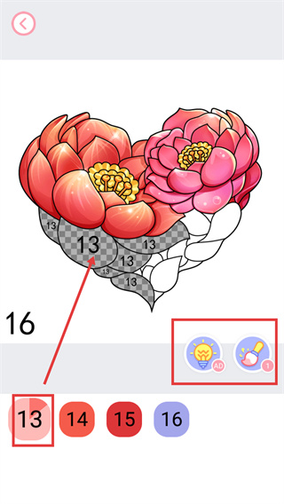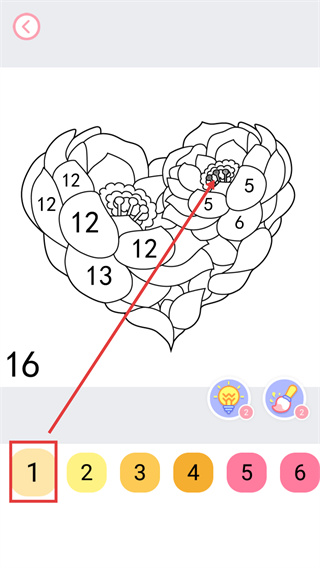 2、进入涂色界面后,选择底部对应数字的颜色,涂图中相同数字的区域,如选【数字1颜色】涂对应区域,可借助提示工具辅助涂色。