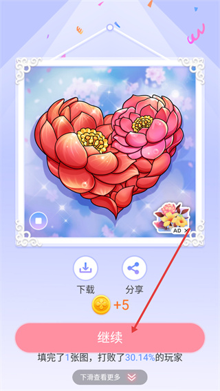 4、涂色完成后,可选择下载或分享作品,点击箭头指向的【继续按钮】,即可进入下一个涂色模板,开启新的创作。