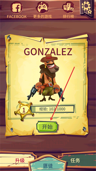 1、角色为【GONZALEZ】,当前经验【102/1000】,点击界面中【开始】按钮进入游戏,参与匪徒玩法可积累经验升级。