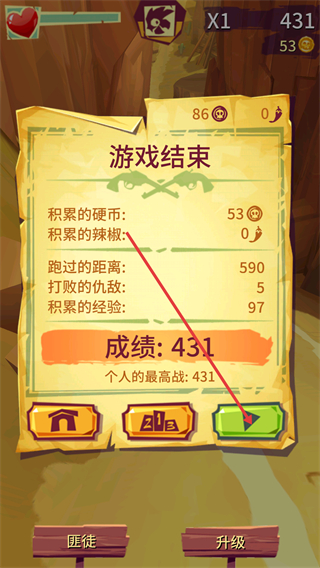 4、游戏结束后查看【积累的金币-53】【跑过的距离-590】等数据,点击对应按钮可再次挑战刷新成绩。
