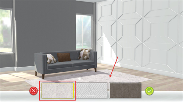 1、装饰空间时先选择地面材质,点击下方对应纹理选项(如当前选中的浅色纹理),预览效果后可确认应用。