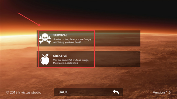 1、开局选择模式:【SURVIVAL】需维持饥饿-口渴-健康状态生存;【CREATIVE】为无敌模式,可无限制创造物品。