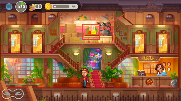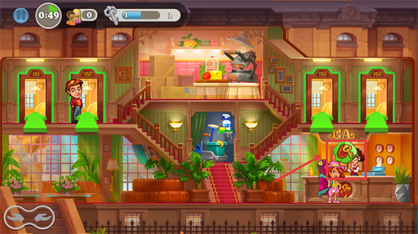 2、关卡中优先获取前台的【钥匙】道具,它是解锁【101】【102】等客房的关键物品,推进服务流程。