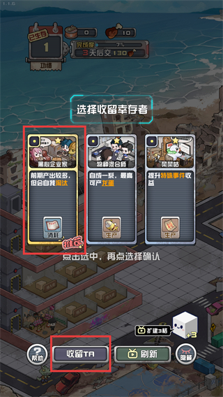 2、选择推荐的【黑心企业家】幸存者,利用其前期高产出特点,点击【收留TA】来补充基地的产能单位。