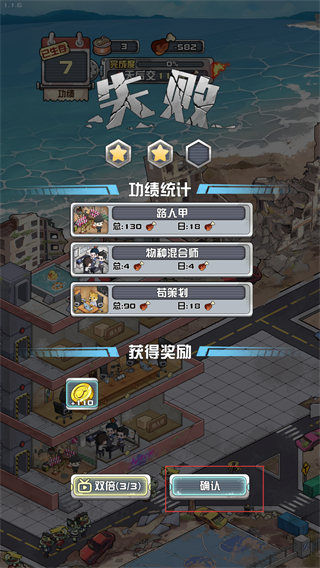 4、结束后,点击【确认】结算【+110】奖励,总结幸存者搭配问题,重新开启生存流程优化资源规划。