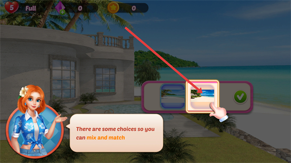 1、进入主页面后根据提示,借助界面的选择功能,按照箭头的指示,进行海滨别墅的背景搭配操作。