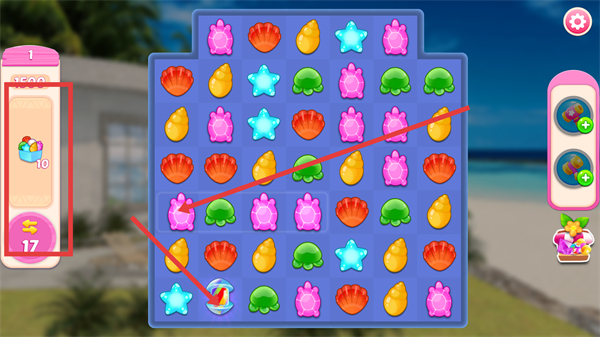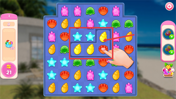 3、跟随手指提示交换对应图标,完成消除操作,推进界面左侧【35】对应的进度数值,逐步达成关卡的消除要求。