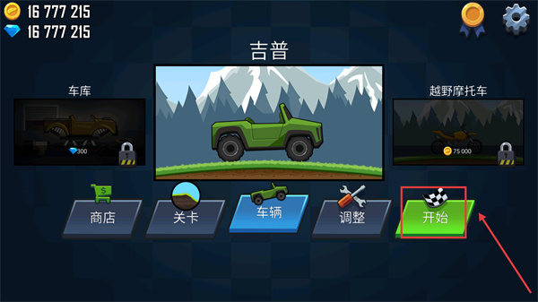 1、选择当前可用的【吉普】车辆,确认后点击【开始】进入关卡,也可通过资源解锁其他车辆拓展玩法。