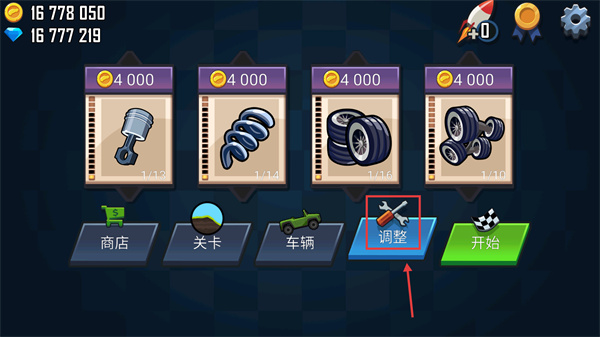 4、关卡结束后进入【调整】界面,消耗资源升级车辆部件(如活塞、弹簧),提升后续关卡的行驶性能。