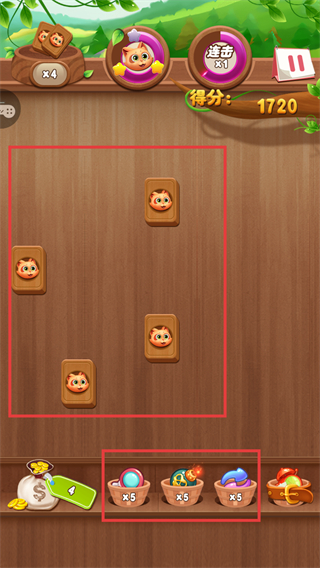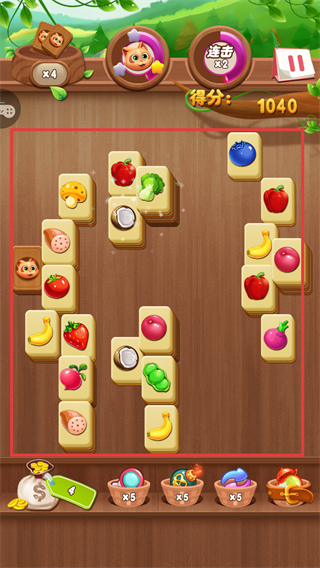 2、推进关卡时优先消除边缘水果解锁中间被挡的目标,顺利完成通关条件获取金币奖励。