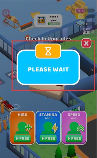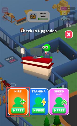 2、在【Check-In-Upgrades】界面,点击【HIRE】对应的【FREE】按钮领取人员,提升值机环节的处理效率。