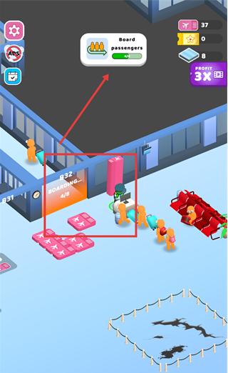 4、招聘完成后,按【Board-passengers】提示,引导乘客至【B32】登机口,推进4/8的任务进度,积累对应资源提升收益。