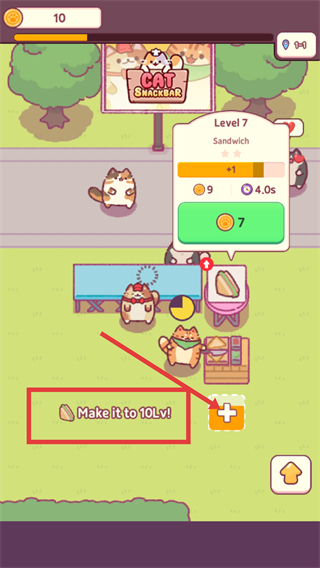 1、处于【Level-7】界面,目标是【Make-it-to-10Lv!】,通过对应操作推进等级,同时可花费金币提升【Sandwich】的相关进度。