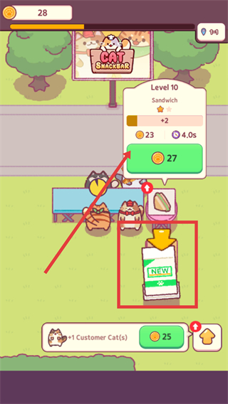 2、达成【Level-10】后,解锁对应【NEW】物品,当前【Sandwich-Level-10】,借助新物品继续推进店铺的运营进度。
