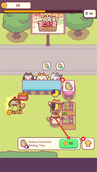 3、消耗【50】金币选择【Reduce-Sandwich-Making-Time】选项,减少三明治制作时长,同时利用【EVENT-FREE-30%】的活动增益提升效率。