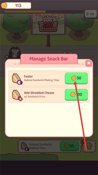 4、进入【Manage-Snack-Bar】界面,消耗金币解锁【Faster】等功能,优化三明治的制作时间与售价,提升店铺收益。