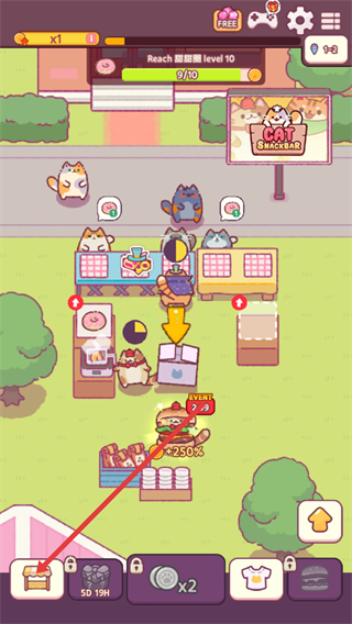 1、处于【Reach-Donut-Level-10-9/20】进度界面,点击对应箱子按钮获取资源,借助【+250%】增益继续推进店铺运营进度。