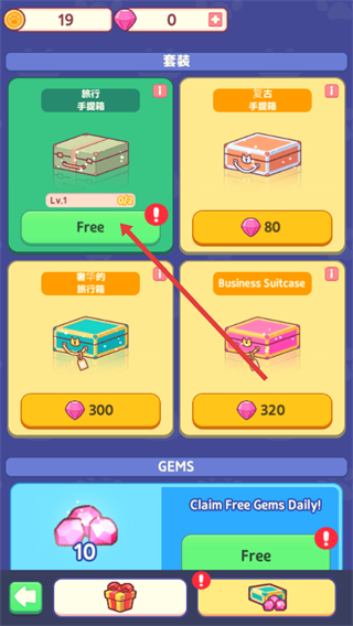 2、在套装界面,点击【旅行手提箱】对应的【Free】按钮免费获取该道具,其余箱子可消耗钻石解锁,按需选择对应内容。
