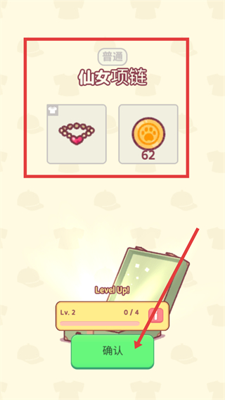 3、获取【普通-仙女项链】时,确认消耗对应货币【62】,点击【确认】按钮领取道具,同时等级提升至【Lv.2】。