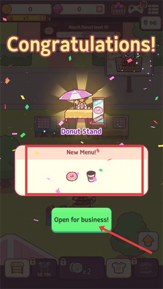 4、解锁【Donut-Stand-New-Menu】后,点击【Open-for-business!】按钮,开启新菜单的营业,拓展店铺经营内容。