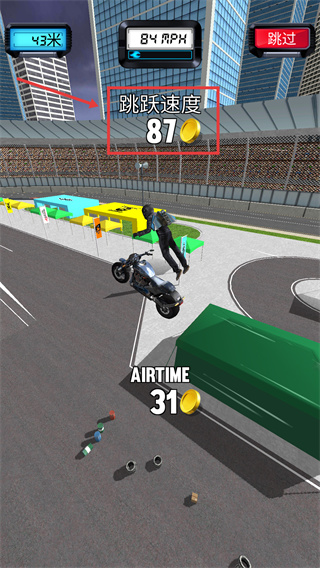 3、跳跃时关注【跳跃速度-87】数值,保持合适速度能延长滞空时间,获取更多奖励。