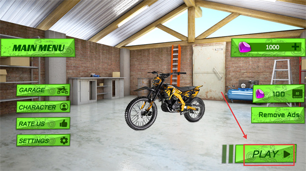 1、在初始界面中,点击【PLAY】可直接进入赛事,也可通过【GARAGE】调整车辆,【SETTINGS】优化游戏设置。