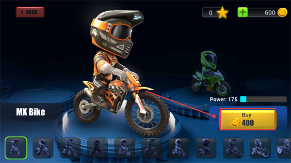 1、在车辆选择界面,可用【400-金币】通过【Buy】按钮解锁【MX-Bike】,其【Power-175】属性可提升比赛表现。
