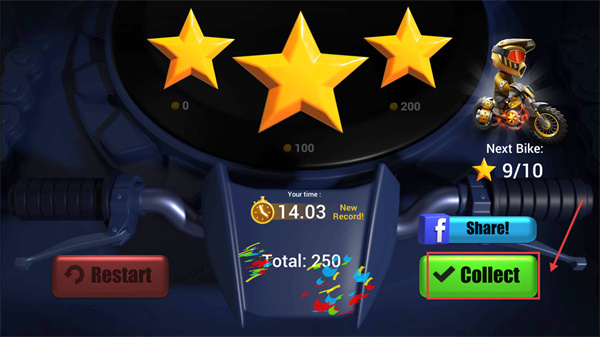 4、通关后点击【Collect】领取奖励,积累星星进度,可解锁【Next-Bike】,提升游戏体验。