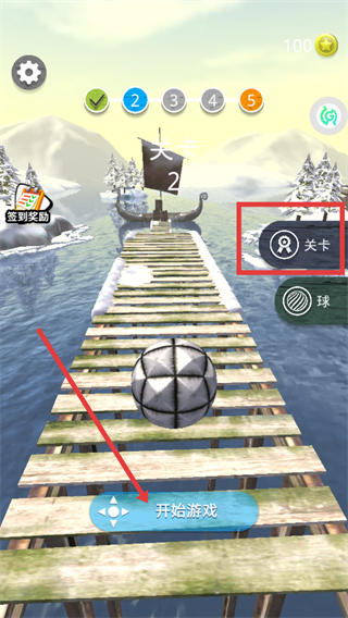 1、点击【开始游戏】进入游戏,操控【球】沿木板桥前进,通过【关卡】按钮可查看当前进度。
