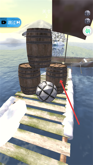 3、遇到【木桶】障碍物时,控制【球】的滚动方向绕行,避免碰撞导致掉落水中。