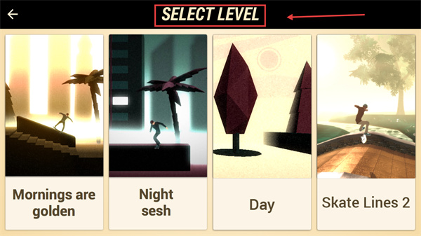 2、在【SELECT-LEVEL】界面,选择对应关卡(如【Mornings-are-golden】),进入该场景的滑板挑战。