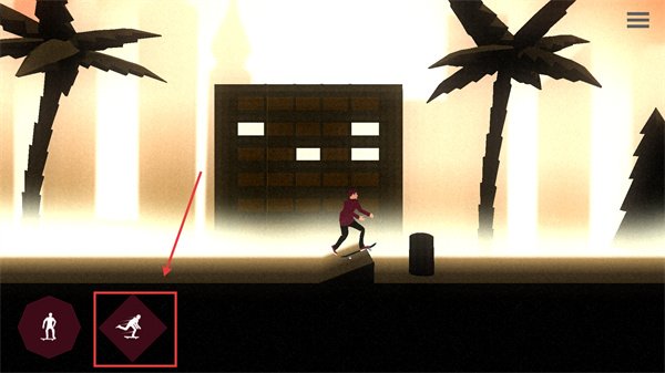 3、关卡中点击左下角站立标识的按钮,控制滑板角色保持基础滑行状态,适应场景节奏。
