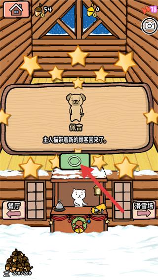 4、解锁新顾客【佩吉】,界面有【餐厅】【滑雪场】切换按钮,点击对应按钮获取顾客佩吉,并切换场景推进进程。