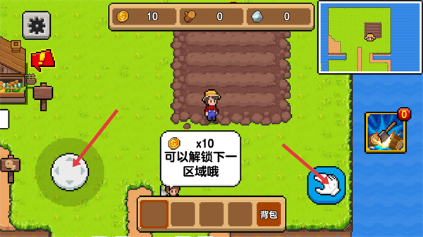 1、当前进入游戏页面,按提示收集对应资源,点击界面元素解锁下一区域,左侧按钮操控玩家移动,右侧按钮播撒种子。