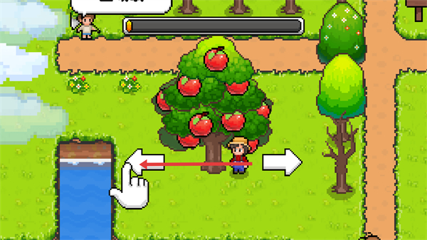 3、操控角色靠近苹果树,按左右箭头提示操作收集果实,完成该区域资源获取以推进进程。