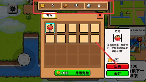 4、打开【背包】查看【苹果15】,可点击【出售】来获取金币,也能消耗金币【升级背包】拓展容量。