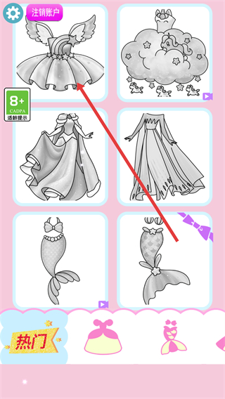 5、将日常中各类别致裙子卡通化,并细致划分主题分类,搭配轻松舒缓的音乐与可爱卡通场景,营造愉悦的涂鸦氛围,吸引宝宝参与。