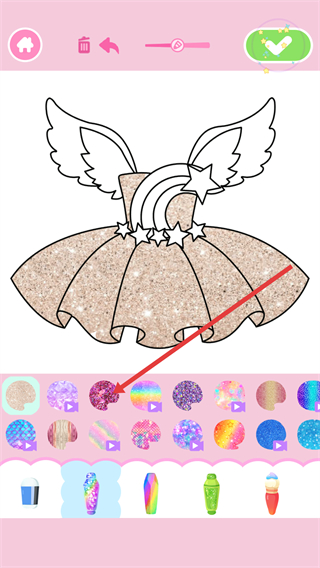 1、提供丰富多彩的颜料与亮粉材料,玩家可通过游戏进程逐步解锁,借助这些材料能绘制出更具光泽感与美感的闪耀公主裙。