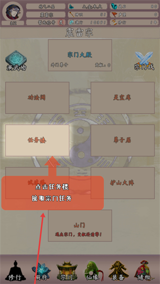 1、进入【震雷宗】界面,点击【任务楼】接取宗门任务,通过完成任务提升在宗门的贡献与地位。