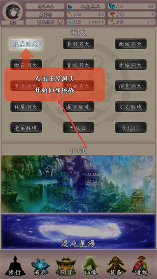 3、进入【仙缘】界面,选择【王屋洞天】开始仙缘挑战,获取提升修为的资源与仙缘机遇。