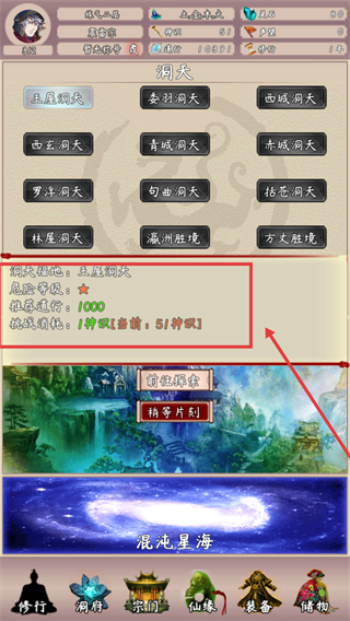 4、挑战【王屋洞天】需满足推荐道行【1000】,消耗【1神识】,点击前往探索开启挑战。