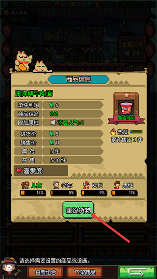 2、在商品信息界面,点击【重设货物】按钮,可调整该商品的售价、库存等设置,优化其销售相关的参数。