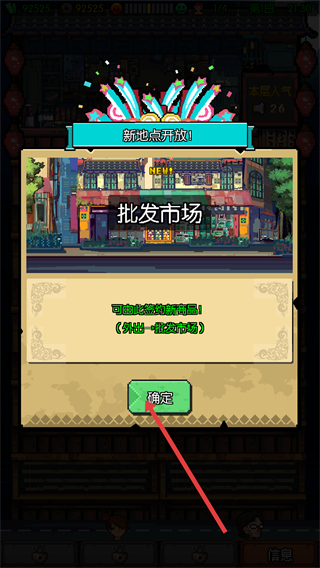 1、在页面中新地点开放,批发市场的提示后,点击【确定】按钮,进入该新地点的相关界面,解锁批发市场的功能。