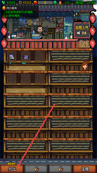 2、在店铺主界面,点击底部的【外出】按钮,进入批发市场对应的采购场景,准备进行商品采购操作。