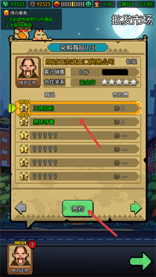 3、在批发市场的采购商品界面,选中目标商品加入小店(如三鹿奶粉)或黑妹牙膏,点击【签约】按钮,完成该商品的采购流程。