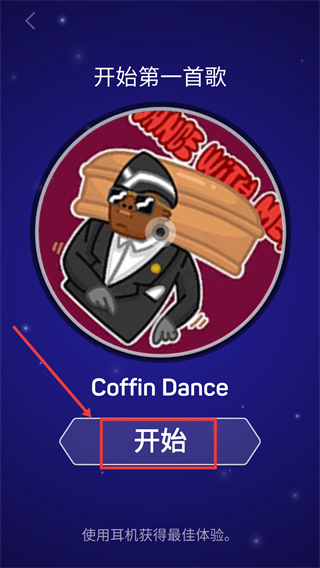1、选择【Coffin-Dance】曲目后点击【开始】进入关卡,建议佩戴耳机以匹配歌曲节奏,提升操作精准度。