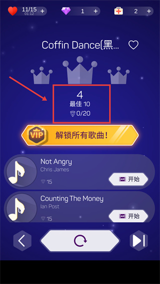 4、关卡结束后查看【4-最佳10】的成绩,积累【钻石】资源可解锁更多曲目,或通过VIP功能解锁全部歌曲。
