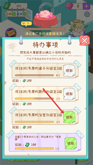4、找到浴室升级任务,点击【领取】按钮获取100金币的任务奖励。